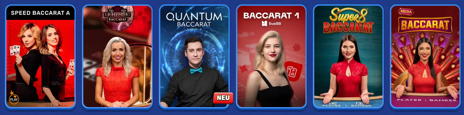 Das klassische Baccarat ist im Pistolo Live-Casino eine der eleganten Optionen für Spieler, die ein schnelles und strategisches Kartenspiel suchen. Das Spiel überzeugt durch einfache Regeln und die Möglichkeit, auf Spieler, Banker oder Unentschieden zu setzen. Live-Dealer sorgen für eine authentische Atmosphäre und professionelle Durchführung der Spielrunden.